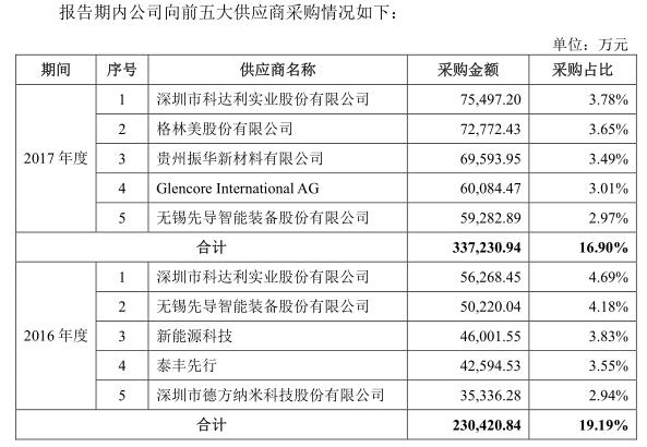 2016年泰丰先行(北大先行)和德方纳米为公司前五大供应商,这两家公司主要产品为磷酸铁锂正极,而2017年格林美、振华新材料、Glencore International AG(嘉能可)则跃居为前五大供应商,格林美和振华新材料主要产品为三元正极,而Glencore International AG(嘉能可)是全球最大的钴贸易商,前五大供应商中材料供应商的变化一定程度表明公司在2017年三元电池出货量大增。另外,科达利依然稳稳占据第一大供应商的位置,先导智能也稳定在前五供应商行列,且2017年贡献5.9亿元,同比增加20%左右。