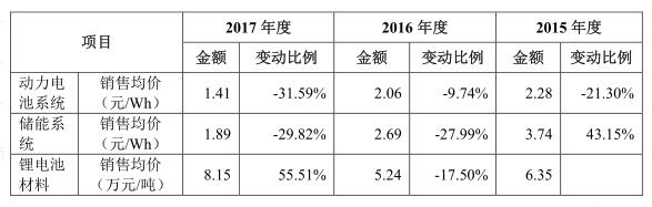2015-2017年公司动力电池产品价格(税后)为2.28元、2.06元、1.41元,下滑幅度分别-21.3%、-9.74%、-31.59%,根据推算,该价格和国轩高科等公司基本一致,并无太大差异。