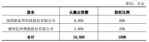 (一)惠州亿纬锂能股份有限公司(以下简称“公司”)拟与深圳新宙邦科技股份有限公司(以下简称“新宙邦”)共同出资设立荆门新宙邦电池材料有限公司(暂定,最终以工商登记主管部门核准的公司名称为准,以下简称“合资公司”)。合资公司注册资本为人民币10,000万元,其中公司出资额人民币2,000万元,占注册资本总额的20%。
