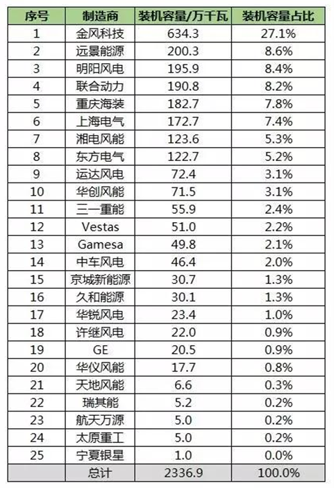 1月26日,在北京举行的2018年中国风能新春茶话会上,中国风能协会公布了2017年中国风电新增装机统计排名的初步结果,数据显示,金风、远景和明阳智能三家企业继续领跑风电制造企业。