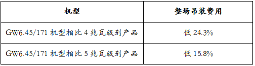 这里以一个20万千瓦的海上风电场为例:选用GW6.45-171机型相对于4兆瓦级别产品,整场吊装费用低约24.3%;相对于5兆瓦级别产品,整场吊装费用低约15.8%。