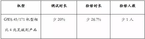 这使得GW6.X-171机型能够在一个20万千瓦装机容量的项目中,相比其他机型的检修天数、检修时长、检修人数均明显减少。从人员与交通成本费用上折算,比4兆瓦机型减少8人,人员成本降低40%;减少1艘双体船舶,交通成本降低40%。