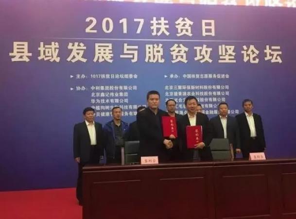 2017年10月10日,由国务院扶贫办主办、中国扶贫志愿服务促进会承办的“2017扶贫日县域发展与脱贫攻坚论坛”在京举行。中利集团创新推出的三代光伏农场精准脱贫项目,得到了国务院扶贫办主任、中国扶贫志愿服务促进会会长刘永富的点名赞赏与肯定。当日,13个贫困县的代表与中利集团签订了“包县脱贫”协议。