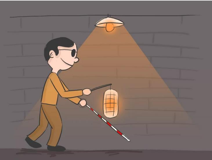 在一个漆黑的夜里,伸手不见五指。一个盲人打着灯笼,慢慢地行走在狭窄的街道上。有个路过的和尚好奇地问他,你一个瞎子,打了灯笼能看得见路吗?