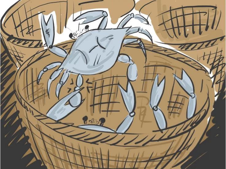 师傅把他们带到海边去看渔民捕蟹。眼前,一只大筐敞开放着,筐里的蟹拼命往外爬。甲和尚感到奇怪,问渔民为什么不把筐盖好。渔民说,一只螃蟹需要盖,一群螃蟹不用盖,因为螃蟹喜欢嫉妒,只要有一只快爬到筐口,另一只就会想方设法把它拖回筐里,就这样循环往复,谁也跑不出去。
