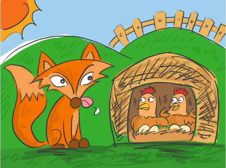 鸡窝里装了很多鸡,狐狸站在外面,拼命往里钻,但因狐狸个大,鸡窝门小,钻了三天三夜才进去。等他一口气吃光了里面的鸡,却发现自己吃撑了,身体发胖,出不了鸡窝了。于是,狐狸被困在鸡窝里饿了三天三夜,直饿得身体消瘦下来,才终于钻了出来。