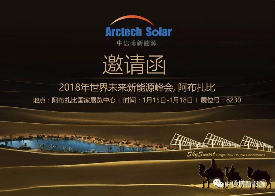 2018年1月15日至18日,中信博新能源将参加在阿布扎比国家展览中心举行的“第十一届世界未来能源峰会暨展会”,并携旗下新品——全球首款专为双面组件设计的“天智跟踪系统”首次亮相。在此,我们诚邀您莅临展位8230,与“天智”零距离接触。