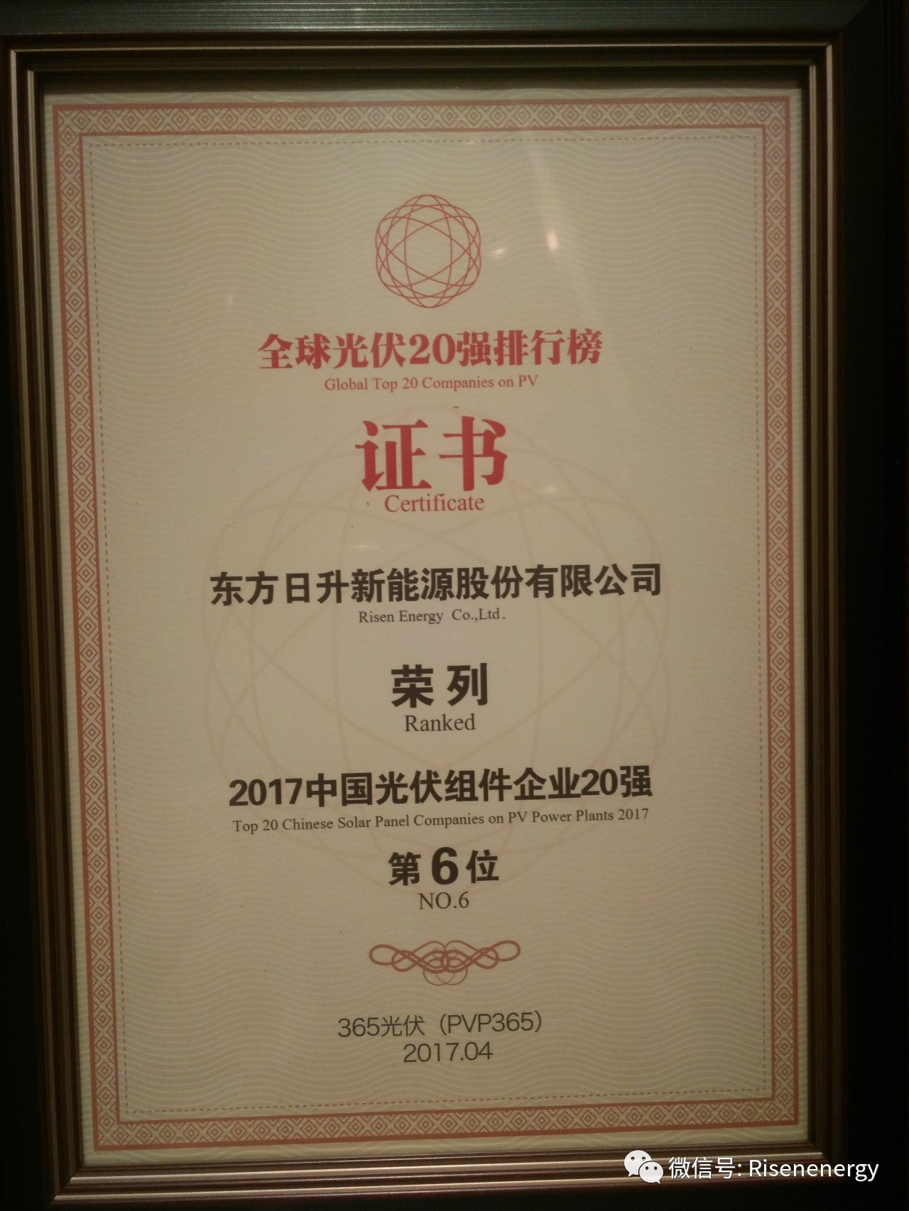 “2016年度中国光伏品牌排行榜组件品牌价值第六名”