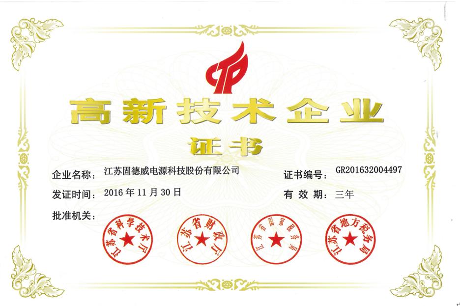 2017年2月24日 固德威荣获“国家高新技术企业”认定