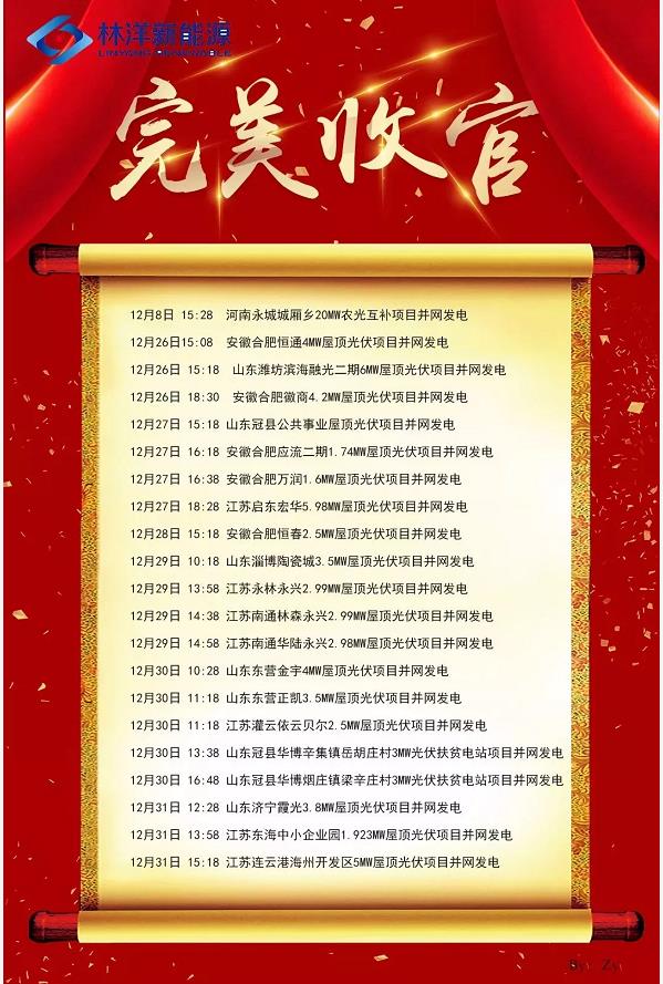 林洋提出"成为智慧分布式能源、能效管理领域最大的互联运营和服务商”的战略目标,为客户提供智慧低碳的系统解决方案。近日,随着光伏行业的“1230”节点来临,林洋新能源江苏、山东、安徽等区域的多座屋顶分布式光伏电站顺利并网,从发电端开始,林洋新能源迈出了打造智慧低碳园区的坚实步伐。