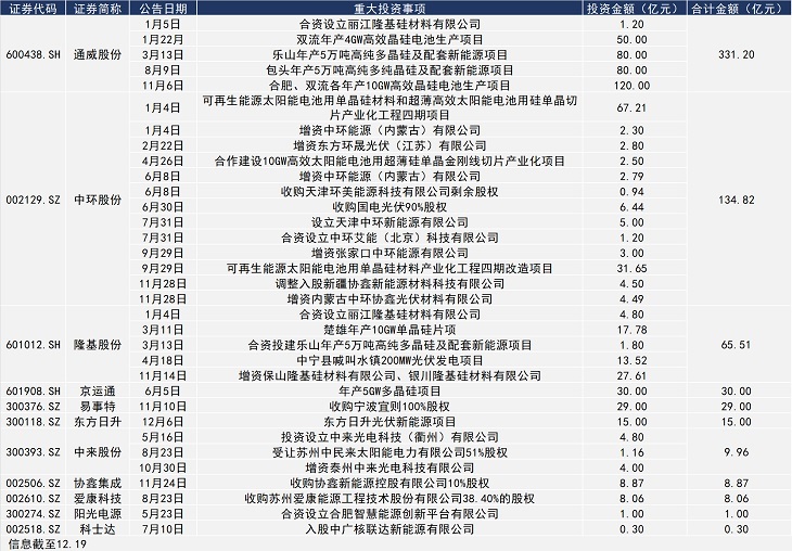 今年A股光伏企业重大投资、收购事项盘点。数据来源:公司公告、界面新闻研究部