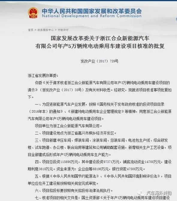 2017年3月28日,发改委发布了《国家发展改革委关于浙江合众新能源汽车有限公司年产5万辆纯电动乘用车建设项目核准的批复》(发改产业〔2017〕729号),同意按照《国务院关于发布政府核准的投资项目目录(2016年本)的通知》和《新建纯电动乘用车企业管理规定》的要求,同意浙江合众新能源汽车有限公司年产5万辆纯电动乘用车建设项目,这意味着浙江合众新能源汽车成为继北汽新能源、长江汽车、长城华冠、奇瑞新能源、敏安汽车、万向集团、江铃新能源、重庆金康、国能新能源、云度汽车、兰州知豆、河南速达之后,第13家获得发改委核准的新建纯电动汽车的投资项目,也是首家研发学术机构进行产学研实践产业化的最新案例。