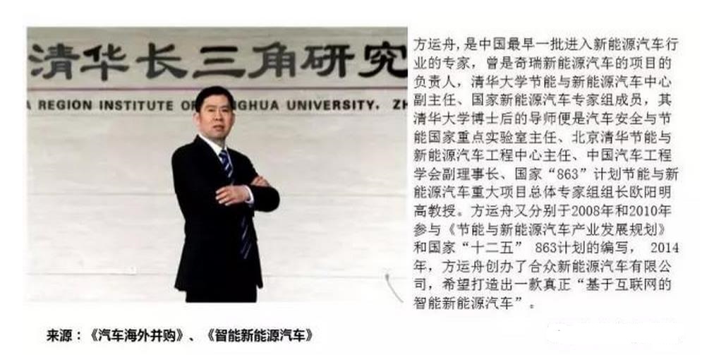 浙江合众新能源汽车有限公司2014年10月由原奇瑞新能源汽车的项目负责人、清华大学节能与新能源汽车中心副主任方运舟注册成立。方运舟是中国最早一批进入新能源汽车行业的专家,是国家新能源汽车专家组成员,其在清华大学博士后的导师便是国家“863”计划节能与新能源汽车重大项目总体专家组组长欧阳明高教授。方运舟分别于2008年和2010年参与《节能与新能源汽车产业发展规划》和国家“十二五863”计划的编写,是最接近国家新能源政策与资质审核的专家之一。