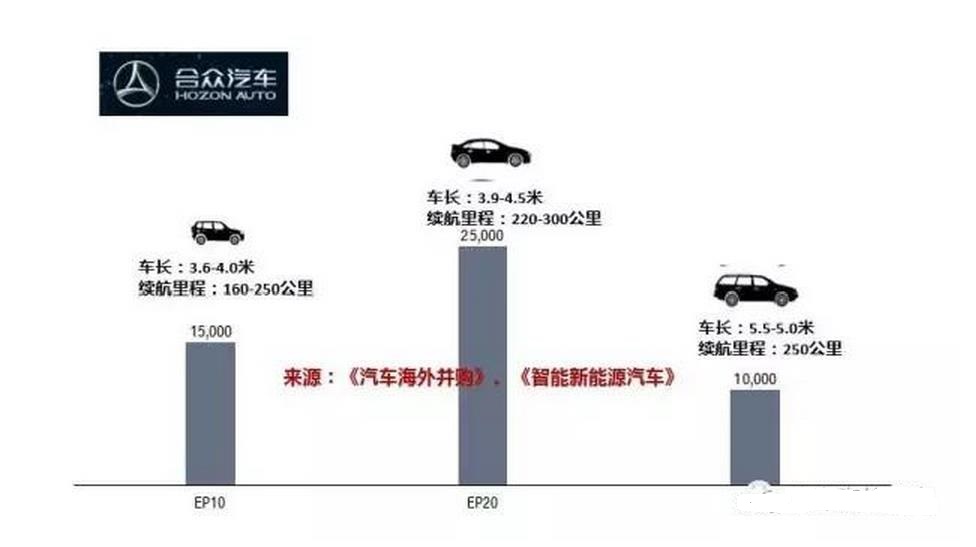 浙江合众新能源汽车产品规划是从低端入手,逐渐提高。合众计划年产5万台纯电动乘用车,包括代号为EP10的年产1.5万台,EP10是A00级别微型电动车,续航里程在160-250公里之间。代号为EP20的年产2.5万台,EP20属于A级城市载客车,续航里程在220-300公里之间,而EP30年产1万台,属于MPV多功能车,续航里程在250公里左右。