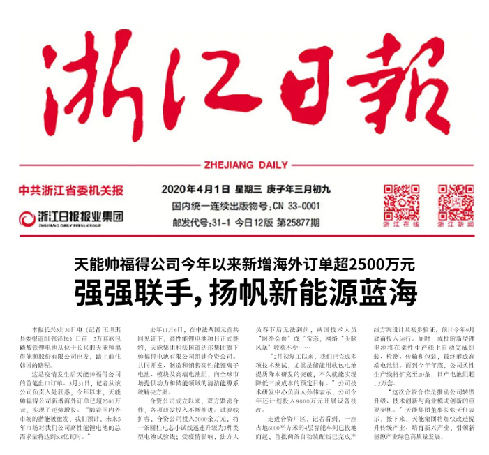 去年11月份,在中法两国元首的共同见证下,天能集团和法国道达尔旗下的帅福得集团在人民大会堂正式签约,强强联手,共拓新能源蓝海。如今,围绕技改、研发、扩建、销售……天能帅福得合资的大项目正紧锣密鼓的推进,动能澎湃。今天的《浙江日报》要闻版,进行了专题报道,一起来看看。