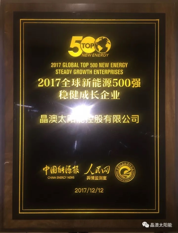 凭借雄厚的实力,晶龙、晶澳连续多年荣登榜单,且不断再创新高,晶澳较去年提升9个名次,晶龙较去年提升1个名次。凭借高性能的光伏产品、稳健的财务状况和一流的行业地位,晶澳被评为“2017全球新能源500强稳健成长企业”。