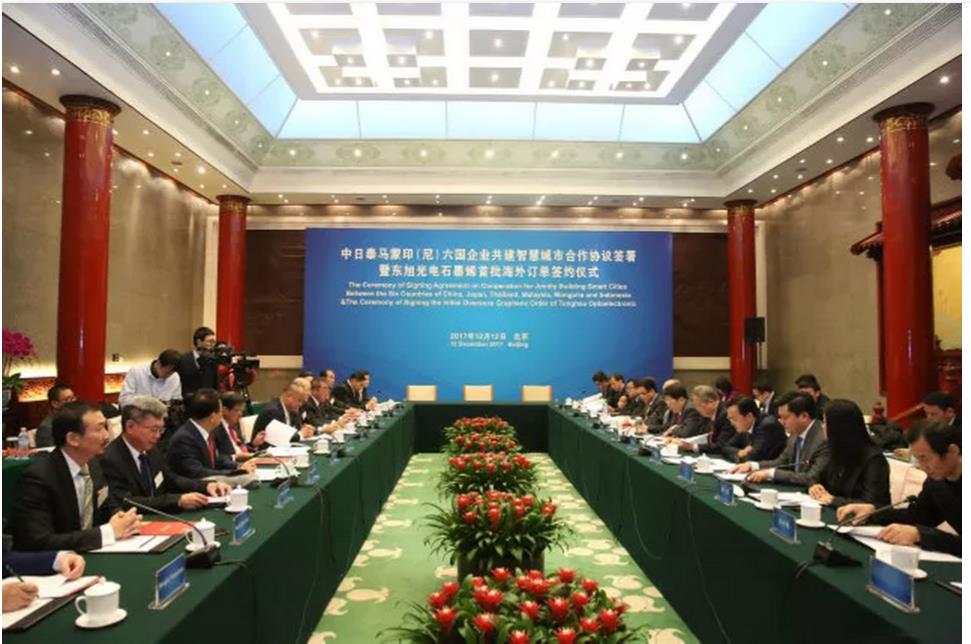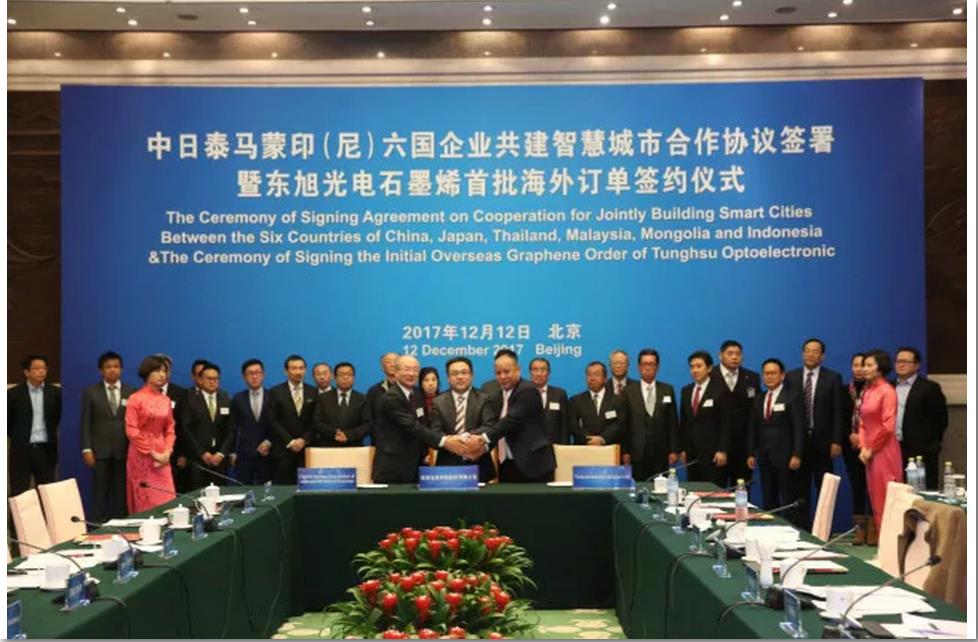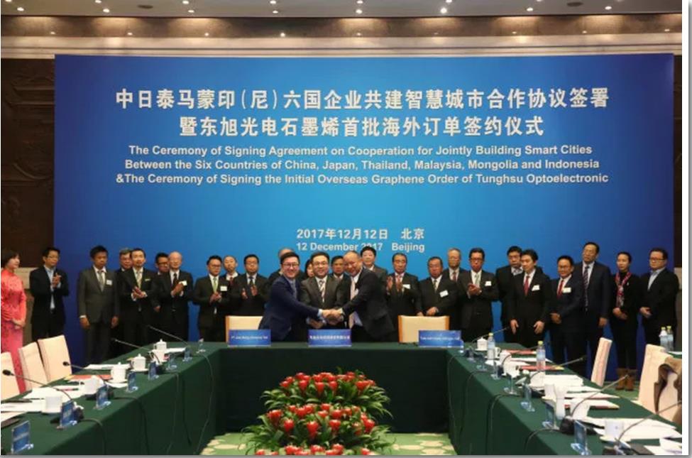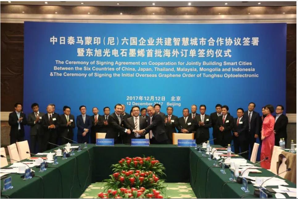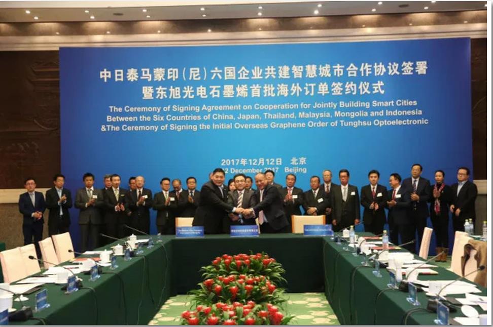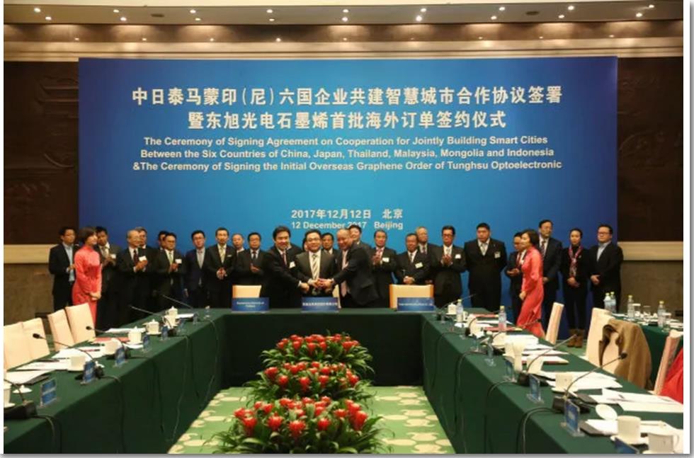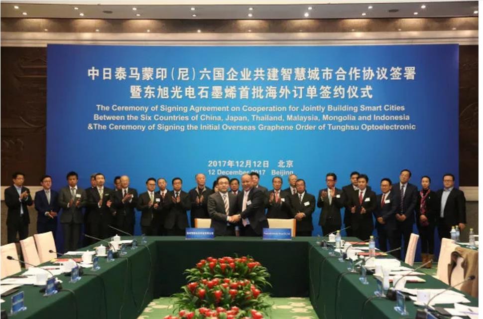 东旭集团旗下上市公司东旭光电在北京举行中日泰马蒙印(尼)六国企业共建智慧城市合作协议签署暨东旭光电石墨烯首批海外订单签署仪式。