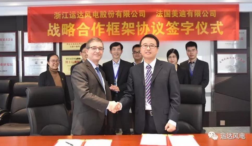 2017年11月28日,浙江运达风电股份有限公司与法国美迪有限公司在运达风电杭州总部签署战略合作框架协议。这标志着运达风电与法国美迪的战略合作进入新的阶段,双方将携手聚焦风电场风资源开发和评估技术,推动风电全生命周期管理平台与数字化、智能化技术的相互融合,运达风电副总经理陈棋、法国美迪公司总裁Didier Delaunay代表双方在协议上签字。