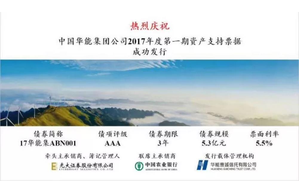 11月24日,中国华能2017年度第一期资产支持票据在银行间市场顺利发行,该项目是我国首单以可再生能源电费补贴款为基础资产的资产证券化产品。