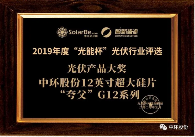 “蓄势待发,云上开年”,中环股份12英寸超大硅片“夸父”G12系列在2019年度“光能杯”光伏行业评选中荣获“年度光伏产品大奖”!中环股份董事长沈浩平代表中环股份出席颁奖典礼,并发表演讲——《光伏产业的创新与未来》。