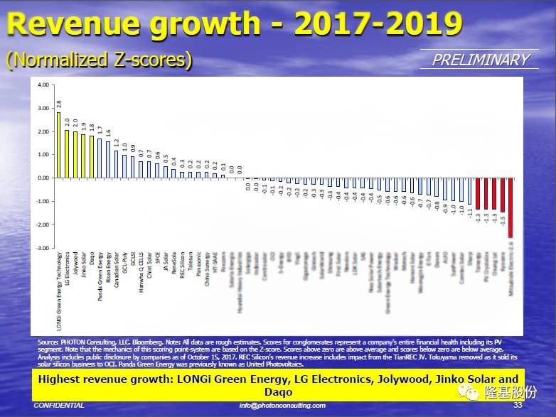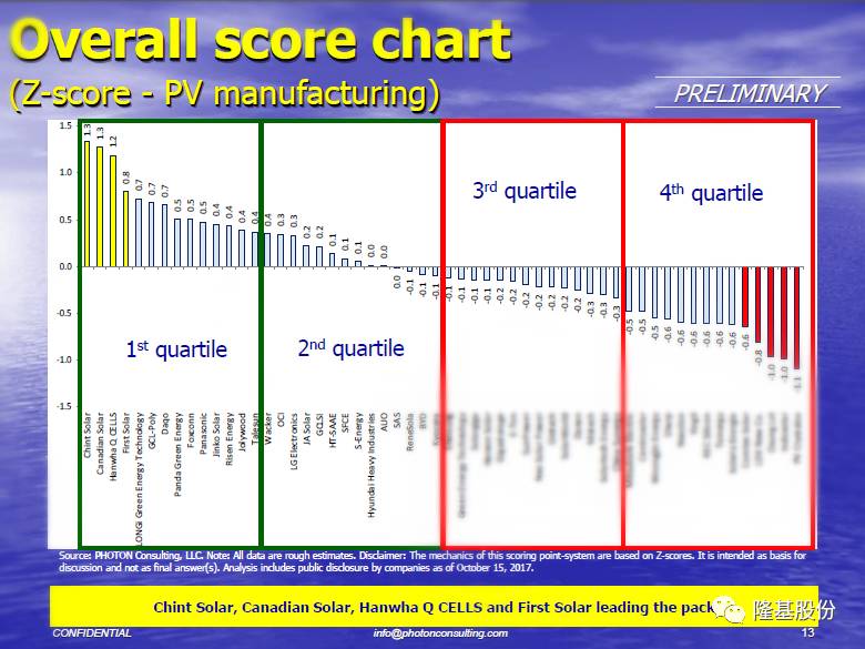 日前,PHOTON Consulting发布了2017年第三季度全球光伏企业“铁人三项”竞争力报告《PV Triathlon》,隆基绿能科技股份有限公司(以下简称“隆基股份”)凭借领先的技术实力位列综合竞争力第一梯队,财务健康指数稳居全球第一。