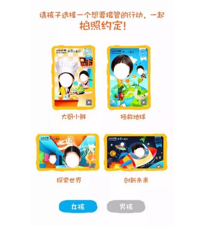 和您的孩子一起,从照片模板中选择他/她想要接管的行动。上传或拍摄您和孩子的双人照片。照片可以被保存并分享在朋友圈中。
