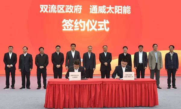 仪式现场,双流区人民政府与通威签订了《高新技术绿色产业园区项目投资框架协议书》及《10GW高效晶硅电池项目投资协议书》;四川大学、西南石油大学、成都理工大学、成都工业学院与通威太阳能公司签订了《校企合作协议》。