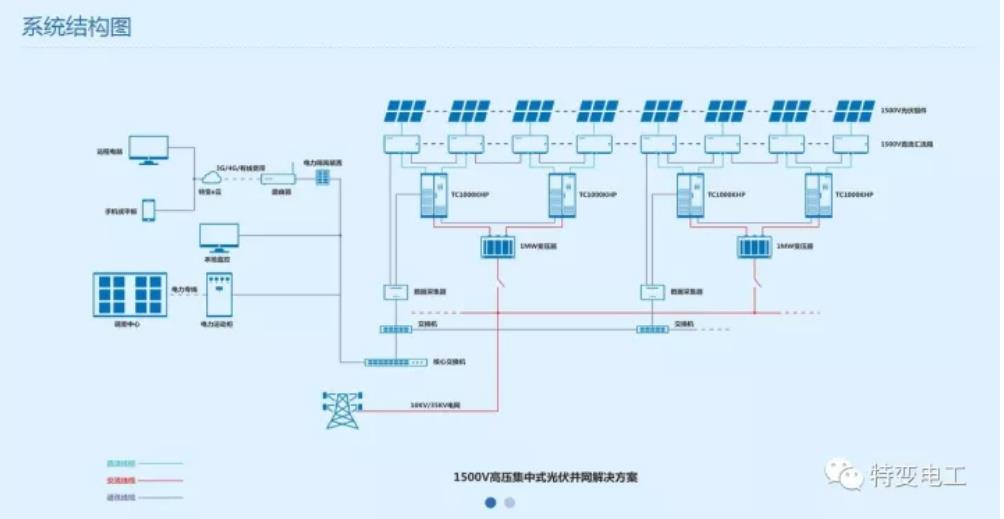 大型地面电站:大型地面或平缓山丘电站所处环境地势较平坦,光伏组件朝向基本一致,无明显遮挡。电站规模较大,电站输出可经升压后接入110kV或220kV高压输电网。