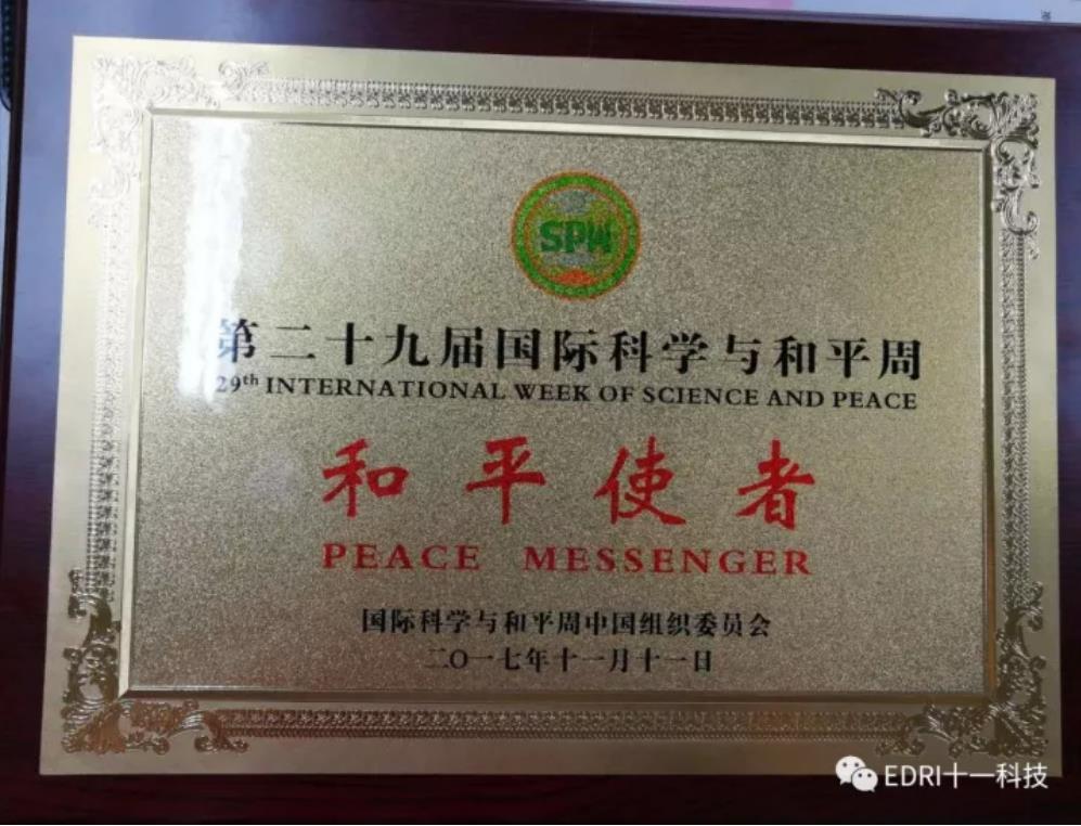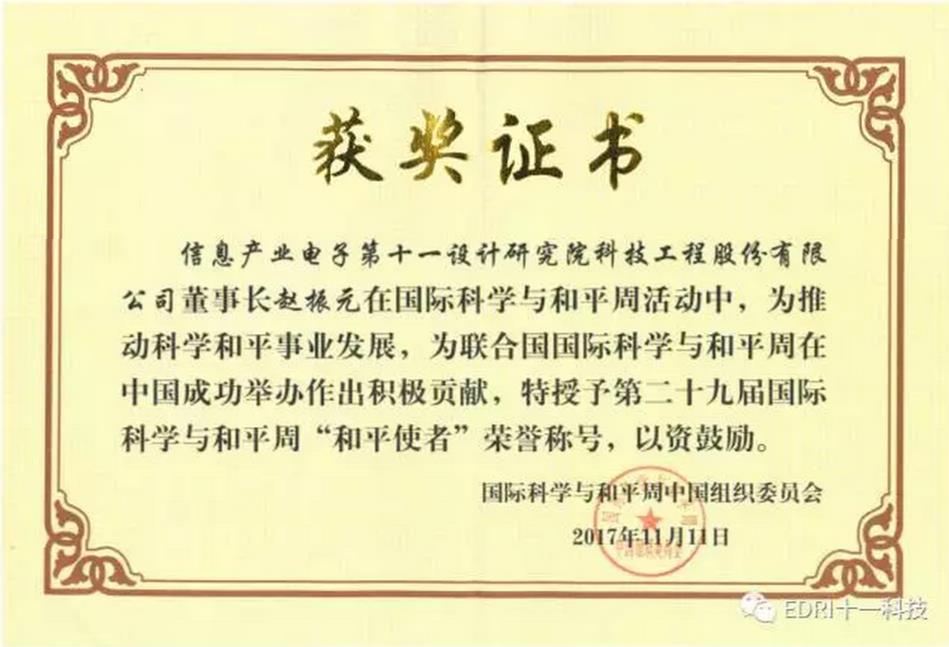 十一科技董事长、党委书记赵振元同志凭借着在新能源领域的突出贡献,凭借着对巩义、阜平等地一系列光伏扶贫的突出成绩,忠实地落实了以习近平为核心的党中央关于对精准扶贫工作的一系列指示,经过国际科学与和平周中国组织委员会严格评审,获第二十九届国际科学与和平周“和平使者”荣誉称号。11月11日,因工作原因,赵振元同志未能亲赴北京领奖,袁士伟同志代赵振元同志在北京全国政协礼堂的第二十九届国际科学与和平周开幕式上领取了“和平使者”证书及奖牌,并在会议期间与党和国家领导人亲切合影。