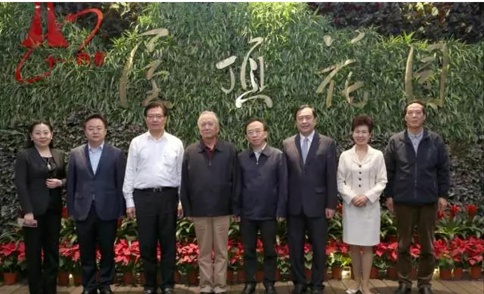 2017年10月19日原CEC总经理杨晓堂同志、无锡市常务副市长黄钦一行与成都市常务副市长谢瑞武(左五)、成华区委刘光强书记(左二)同十一科技董事长兼党委书记赵振元同志、执行院长何平同志在十一科技屋顶花园亲切合影