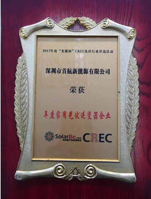 11月1日,2017年“光能杯”CREC年度光伏行业评选活动暨颁奖盛典在无锡隆重举行。首航新能源凭借着自身优异的产品质量和全方位的系统解决方案,从众多优秀企业中脱颖而出,荣获2017“光能杯”CREC年度家用光伏逆变器企业,充分体现了首航新能源在光伏逆变器领域的行业领导者形象,并展现了首航新能源在光伏领域品牌影响力。