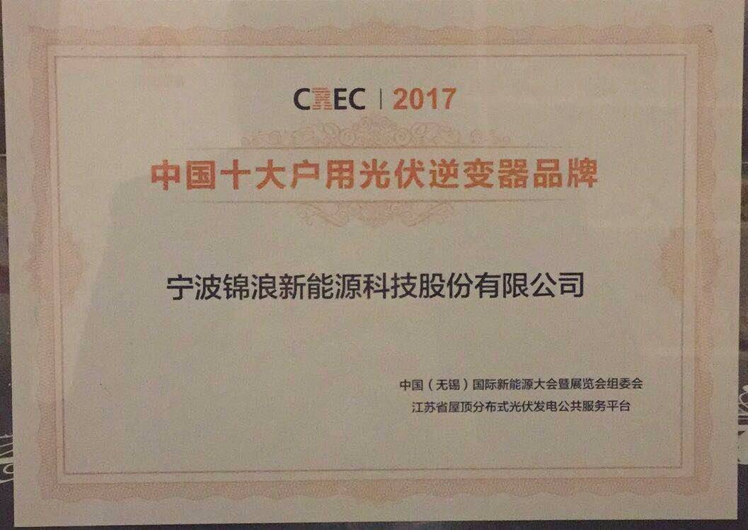 “中国十大户用光伏品牌评选”活动由中国(无锡)国际新能源大会暨展览会组委会和江苏屋顶分布式光伏发电公共服务平台联合主办。在11月3日晚,CREC2017中国十大户用光伏品牌颁奖典礼盛典隆重举行,并成功揭晓获奖品牌。锦浪科技有幸参与本次评选,并斩获“中国十大户用光伏逆变器品牌”殊荣。