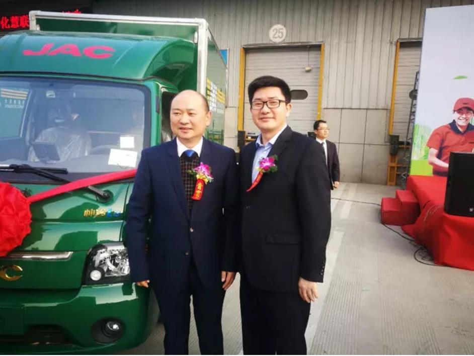 江淮汽车总经理项兴初与国轩高科执行总裁胡江林(右)在帅铃物流车前合影