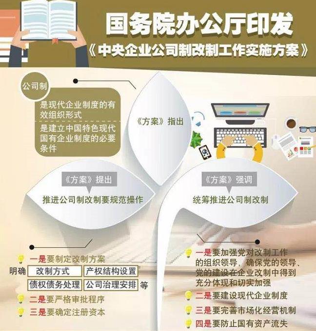 2017年 6月26日,中央全面深化改革领导小组第三十六次会议审议通过《中央企业公司制改制工作实施方案》。会议强调,公司制是现代企业制度的有效组织形式,是建立中国特色现代国有企业制度的必要条件,今年年底前基本完成国有企业公司制改制工作。