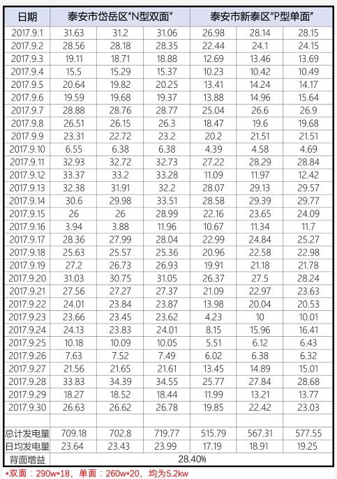 此次在山东地区光满满光伏小镇中选取数据,泰安市岱岳区用户安装的是中来N型双面高效组件,新泰区安装的为P型单面组件,9月份的每户发电数据对比显示,N型双面增益平均在28 %左右,以其中各三户人家为例,数据如下图,增益达28.4%,目前在业内属于领先地位。