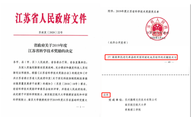 日前,江苏省人民政府发布了《省政府关于2019年度江苏省科学技术奖励的决定》,腾晖光伏与南京航空航天大学及常熟理工学院联合申报的“高效率抗老化单晶硅双面双玻电池及组件的关键技术与应用”项目获得了2019年度江苏省科学技术奖三等奖。