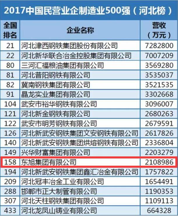 今天上午,由全国工商联发布的“2017中国民营企业500强”榜单揭晓,华为控股有限公司、苏宁控股集团、山东魏桥集团位列前三,河北省包括东旭集团在内的19家民营企业上榜。同时,东旭集团也成功进入中国民营企业制造业500强。