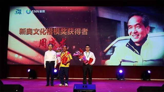 对文化楷模、文化践行优秀集体、劳动模范的表彰将大会引向高潮。集团薪酬与提名委员会主席、常务副总裁金永生宣读了《新奥集团关于授予海宁新奥燃气维修员周成龙同志文化楷模荣誉称号、授予廊坊新奥燃气新奥文化践行优秀集体荣誉称号的决定》,集团党委书记鞠喜林宣读了《新奥集团关于表彰2015-2017年度劳动模范的决定》。王玉锁主席亲自为文化楷模、文化践行优秀集体颁奖,集团总裁张叶生、党委书记鞠喜林为劳动模范颁奖。由新奥人创作的《良知颂》、《东方欲晓君行早》、《我们为新时代领航》歌曲响彻会场,歌颂新文化的优美旋律让人心潮澎湃。