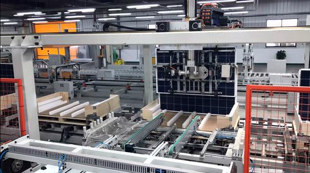 除此之外,我们还有全球第一台双玻组件的自动封边机,以及全球第一台双玻组件的自动包装机。天合光能盐城工厂在各个环节上都体现着这个全球最大单体双玻组件生产基地的先进性。