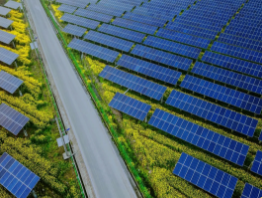 这一片片光伏板沉浸在热烈的金色里,彼此浪漫相拥,宛如花海中的一面面“明镜”,又像金色的沙滩泛着海水的点点光亮,微风吹过,金浪滚滚,蓝海滔滔,那扬起的一朵朵明黄浪花,在光伏组件的蓝色海洋里翩然起舞,尽情享受阳光的滋润。
