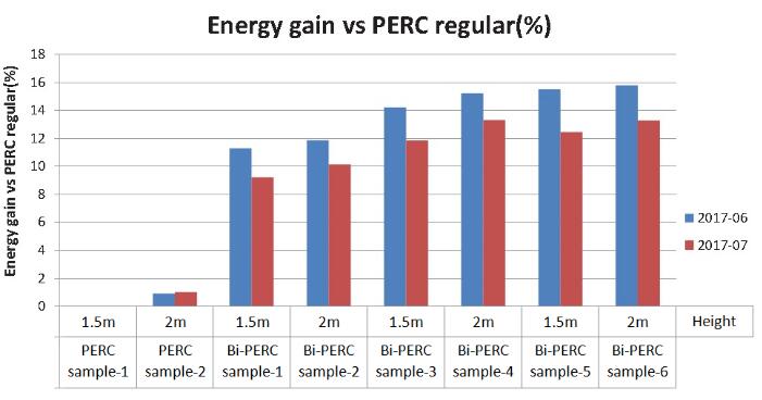 下图是晶澳在实证场地获得的数据。实验对比了在同样地面背景下,组件离地面不同高度、不同类型PERC双面(Bi-PERC)组件发电量的增益。结果表明:双面PERC组件对比单面PERC组件,发电量高出8%-16%;组件离地面高度2m对比1.5m,发电量高0.5%-1.5%。双面发电增益获得第三方论证工作正在进行,晶澳会择时发布。