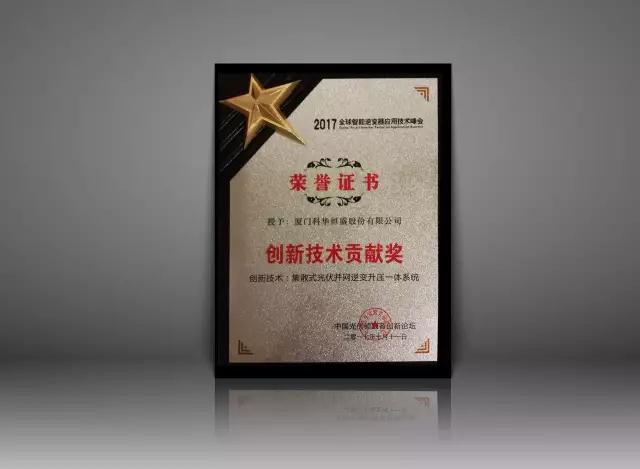 基于以上技术创新优势,科华恒盛集散式光伏并网逆变升压一体系统最终获得专业评审的认可,荣获2017全球智能逆变器创新技术贡献奖。