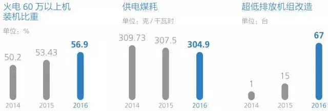 截至2016年底,国家电投60万千瓦级及以上等级机组占煤电装机容量的56.9%;全年环保技改资金投入38.64亿元,累计完成机组超低排放改造67台,容量达到3190.8万千瓦;脱硫装备率和脱硝装备率均达到100%,供电煤耗率由2015年的307.5克/千瓦时下降至304.9克/千瓦时。