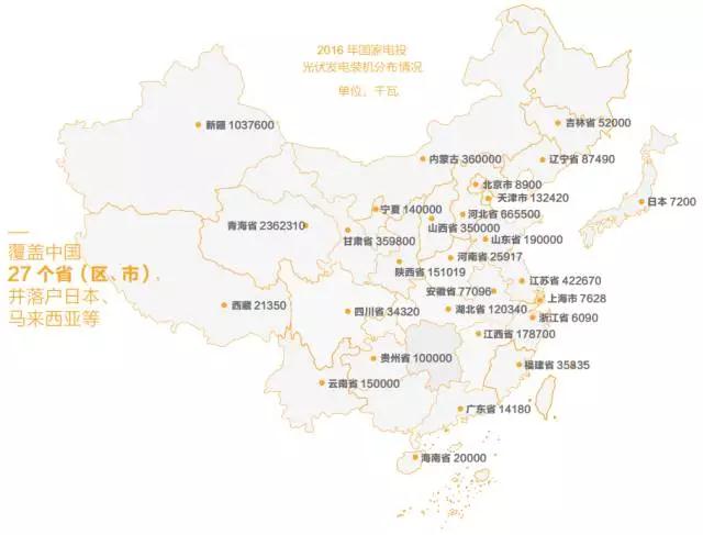 截至2016年底,国家电投共投资运营风电装机1198.22万千瓦,主要分布在青海、新疆、甘肃、内蒙古、江苏等25个省区;投资运营光伏装机711.84万千瓦,形成了酒泉、共和、格尔木、哈密、盐城等大型新能源基地,资产主要分布在青海、新疆、河北、江苏、甘肃等27个省区(不含境外)。
