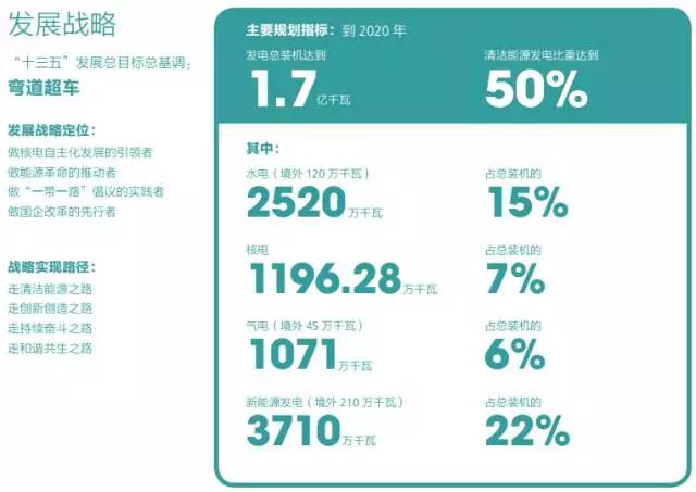按照国家电投的规划,到2020年,发电总装机将达到1.7亿千瓦,清洁能源发电占比将达到50%。其中,水电境外120万千瓦,气电境外45万千瓦,新能源发电境外210万千瓦。
