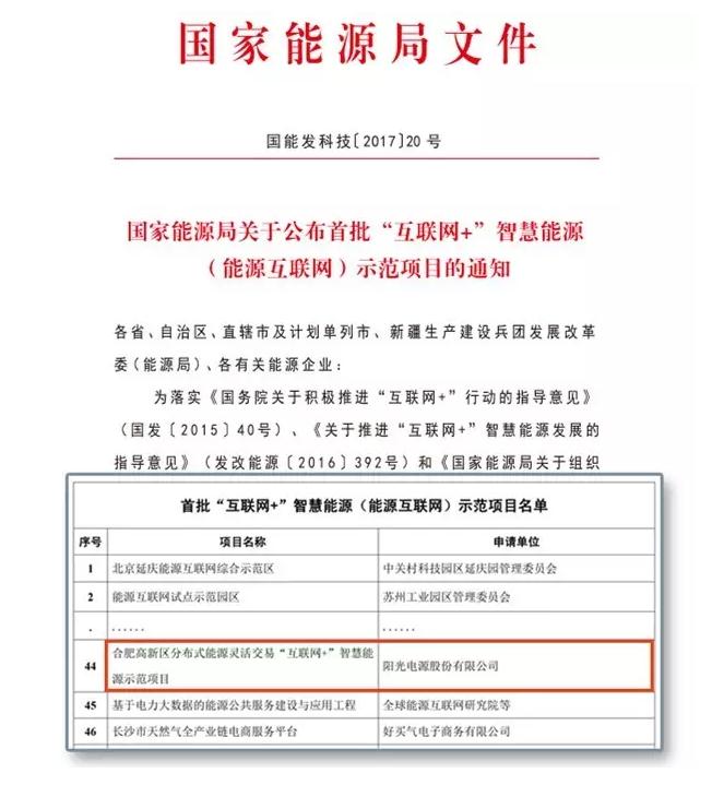 国家能源局今日下发通知,公布首批55个“互联网+”智慧能源(能源互联网)示范项目名单,阳光电源“合肥高新区分布式能源灵活交易‘互联网+’智慧能源示范项目”入选。