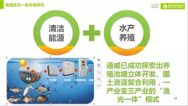 通威“渔光一体”“水上产清洁能源、水下产健康通威鱼”的发展模式,实现了“鱼、电、环保、旅游、税收”五丰收,真正实现了集约化、规模化、科技化、智能化的养殖模式和国土资源的立体开发。