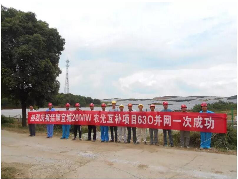 猛狮宜城流水镇襄南农场20MW农光互补项目由宜城猛狮清洁能源科技有限公司投资建设,项目采用“光伏发电综合农业开发”模式建设,太阳能光伏阵列上方接收太阳能实现发电,阵列下部空间种植耐阴作物,实现一地两用,有效提高单位面积土地的综合效益,是“能源+生态”模式的“农光互补”绿色环保型项目。