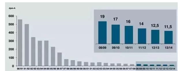 西门子废品率一直在下降,从下图看出,90/91年,每100万件产品中有约560件废品,而到13/14年,每100万件产品仅有11.5件废品。