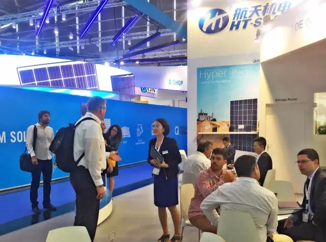 在今年的德国慕尼黑国际太阳能技术博览会(Intersolar Europe)现场,航天机电携“HyperC高效单晶组件”、“Hyper Black高效多晶组件”、“银河”新一代高效N型双面双玻五栅组件、多主栅组件等主打产品亮相。航天机电以新的姿态全面展示企业最新科技成果和成功经验,其主打产品亦受到了现场参观者的关注和诸多行内客户的垂询。